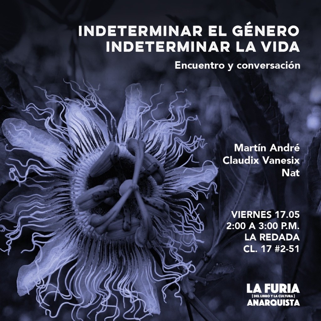 Un espacio de encuentro y conversación sobre nuestras ideas, experiencias y propuestas inconformes con las categorías de género, y sobre cómo ellas son espacio propicio para la creación y la emergencia de otras comprensiones de la vida y la naturaleza, que acojan su naturaleza ácrata de formas que a su vez sobrepasen las limitaciones que aún en espacios anarquistas impone el cis-hetero-patriarcado. Queremos proponer un espacio para acompañarnos y hablar sobre género, feminismos, anarquismos, antropocentrismo y otrxs, para tomarnos espacios políticos que también deben mutar, diversificarse. Será un espacio para personas con experiencia de género no conforme, en el que participaremos Martín André @martin_contilde de @alienhadas_ y @atac_colombia , Claudix Vanesix @claudixvanesix de @amixr.xr y Nat @natalialarivera de @mutantelab .