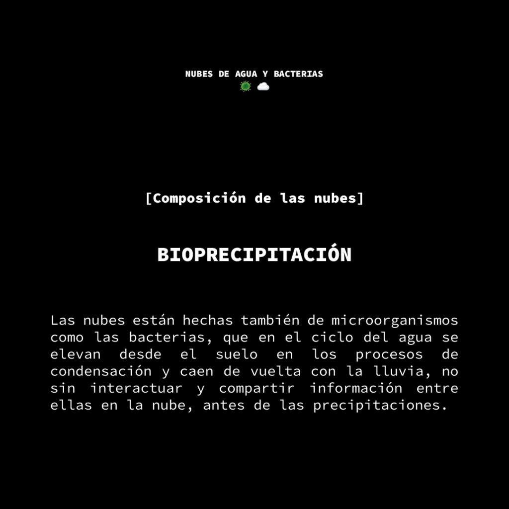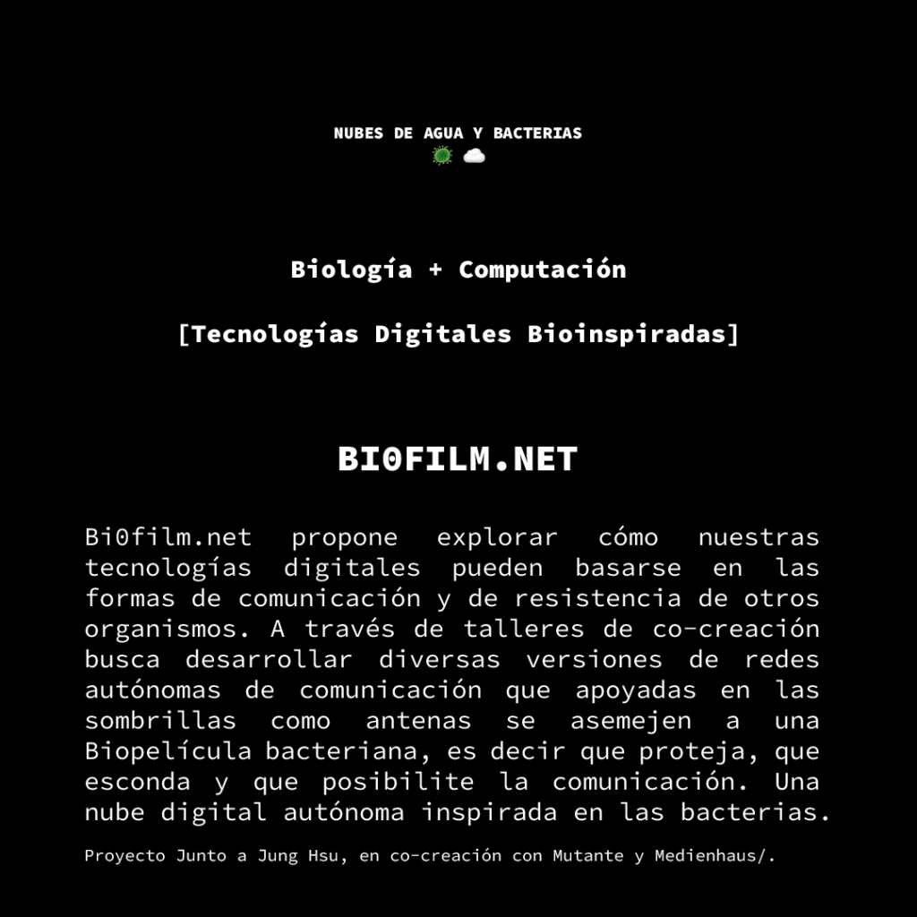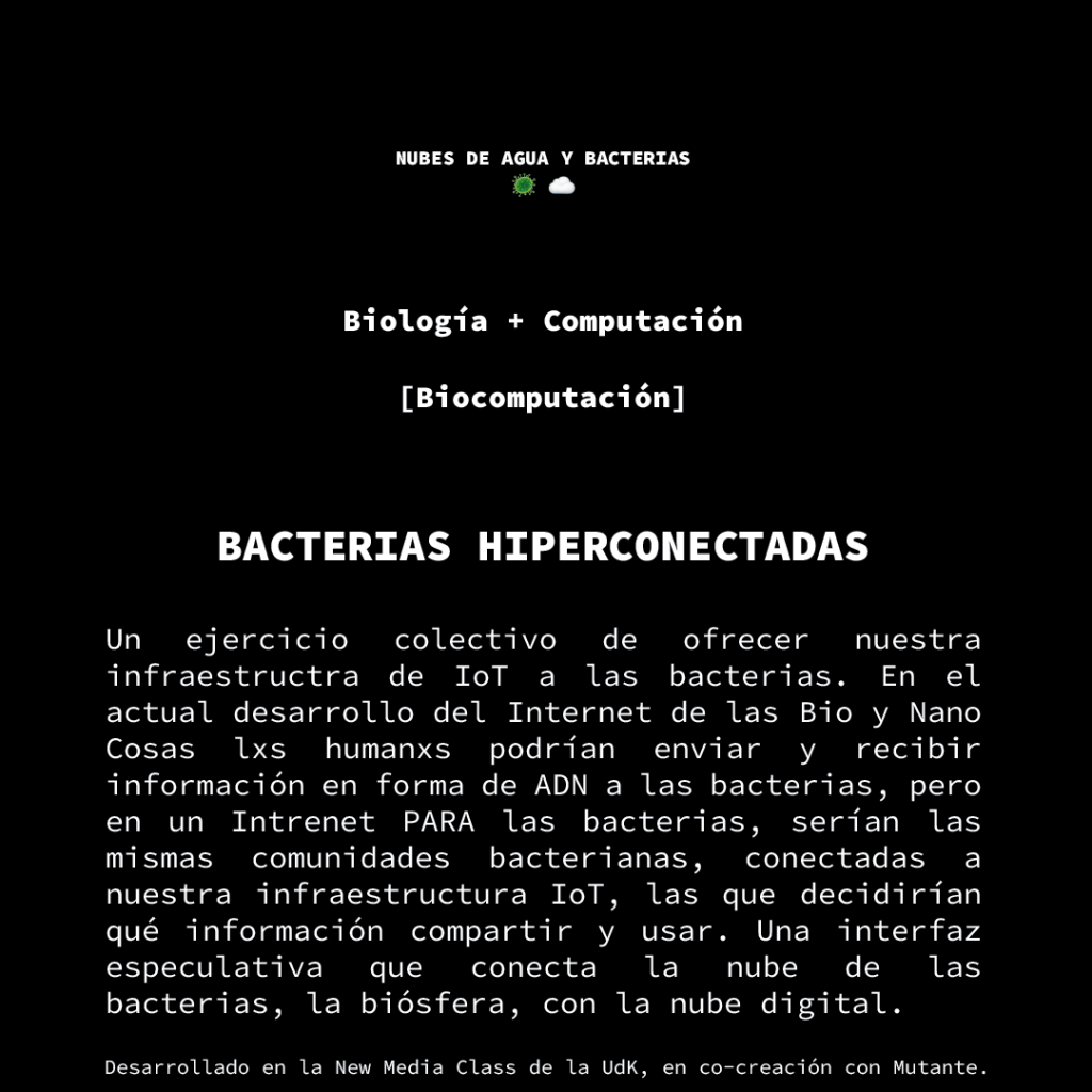 Además de agua, hielo y microplásticos, las nubes están hechas de bacterias. Ese entramado de vida, superorganismo de microorganismos intra-conectados, esa red simbiótica biodigital, que es la biósfera, las incluye. Al interior de ella, la capacidad de transmitir información de forma horizontal que tienen las bacterias les permite formar una red de redes, una internet, mucho mejor, distribuida. Biología y computación se encuentran en la metáfora, pero también en la creación bioinspirada, explorando las posibilidades de que nuestras tecnologías digitales actúen más como vivas, es decir que sean evolutivas, adaptativas y se alejen del control. Un encuentro aún más fuerte, en el campo de la Fabulación Especulativa, un puente entre lo vivo orgánico y lo vivo digital a través de la biología sintética permitiría el desarrollo de tecnologías biodigitales para co-crear, co-metabolizar y co-evolucionar con otras formas de vida. Contra el desarrollo tecnológico digital basado en el ecocidio, nuevas/otras relaciones no antropocéntricas con lo vivo y sus tecnologías.