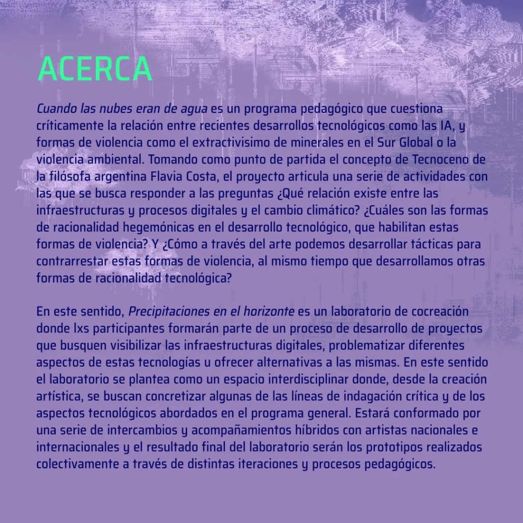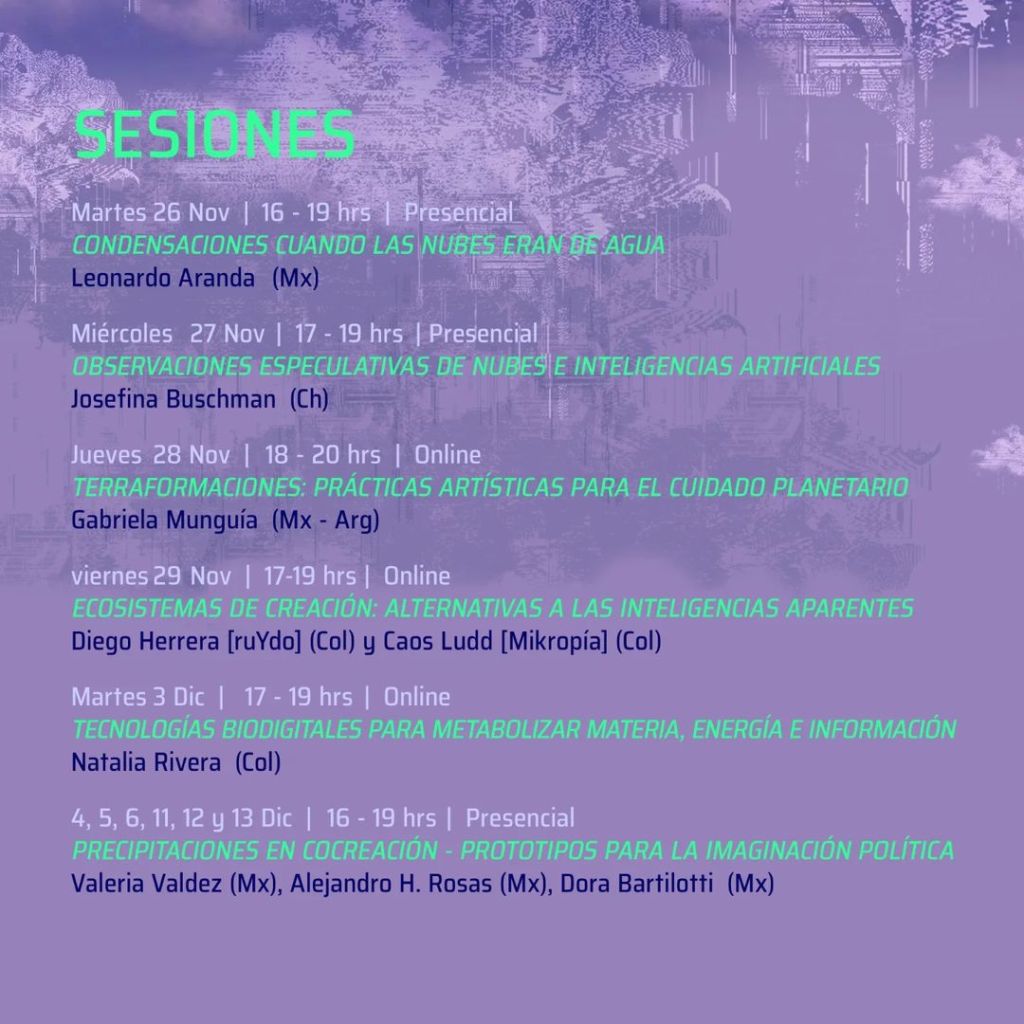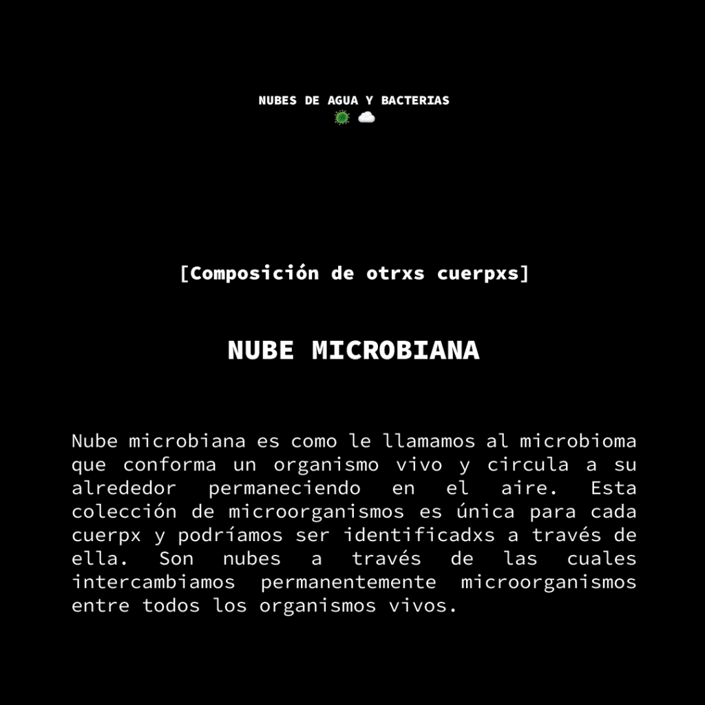 Además de agua, hielo y microplásticos, las nubes están hechas de bacterias. Ese entramado de vida, superorganismo de microorganismos intra-conectados, esa red simbiótica biodigital, que es la biósfera, las incluye. Al interior de ella, la capacidad de transmitir información de forma horizontal que tienen las bacterias les permite formar una red de redes, una internet, mucho mejor, distribuida. Biología y computación se encuentran en la metáfora, pero también en la creación bioinspirada, explorando las posibilidades de que nuestras tecnologías digitales actúen más como vivas, es decir que sean evolutivas, adaptativas y se alejen del control. Un encuentro aún más fuerte, en el campo de la Fabulación Especulativa, un puente entre lo vivo orgánico y lo vivo digital a través de la biología sintética permitiría el desarrollo de tecnologías biodigitales para co-crear, co-metabolizar y co-evolucionar con otras formas de vida. Contra el desarrollo tecnológico digital basado en el ecocidio, nuevas/otras relaciones no antropocéntricas con lo vivo y sus tecnologías.