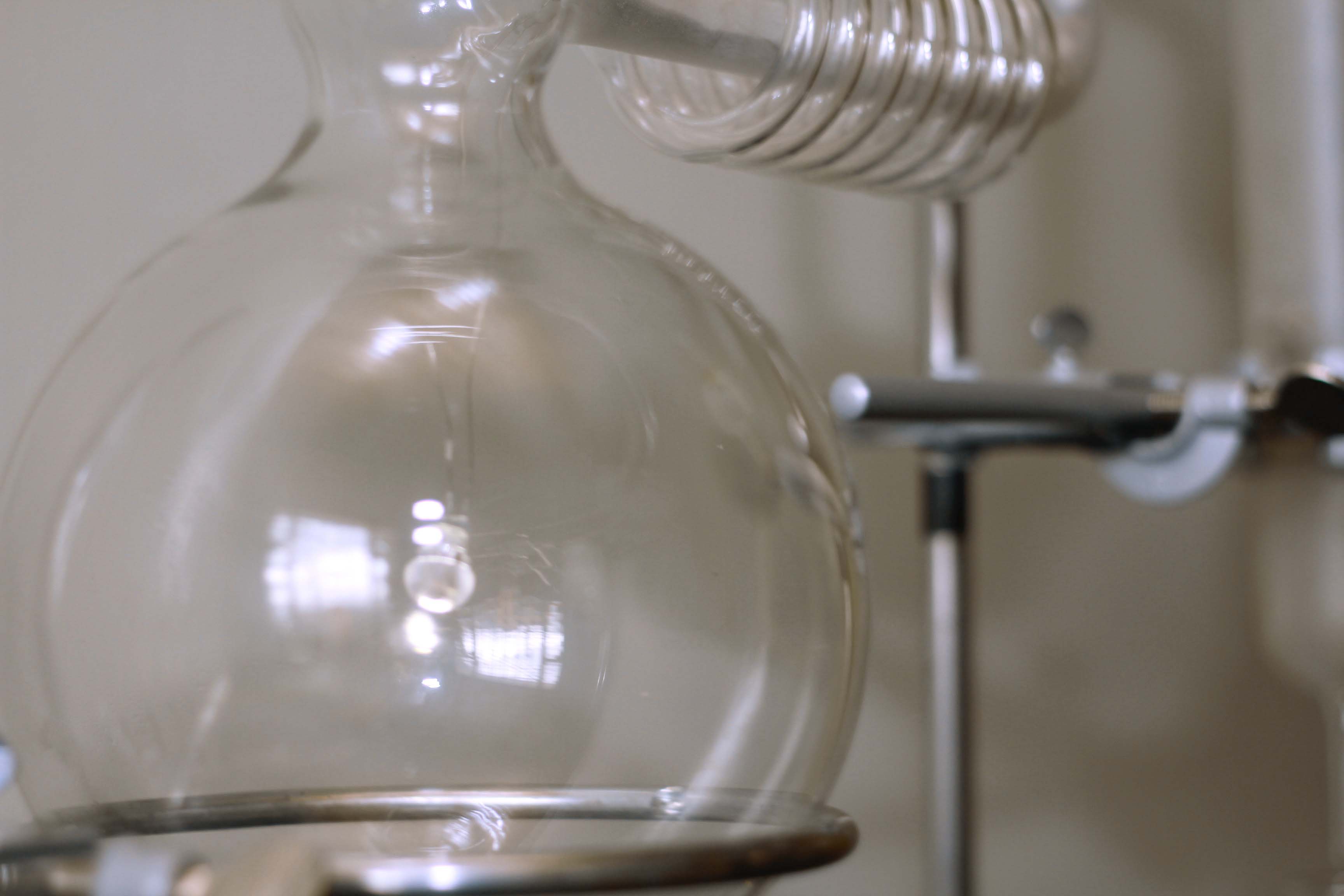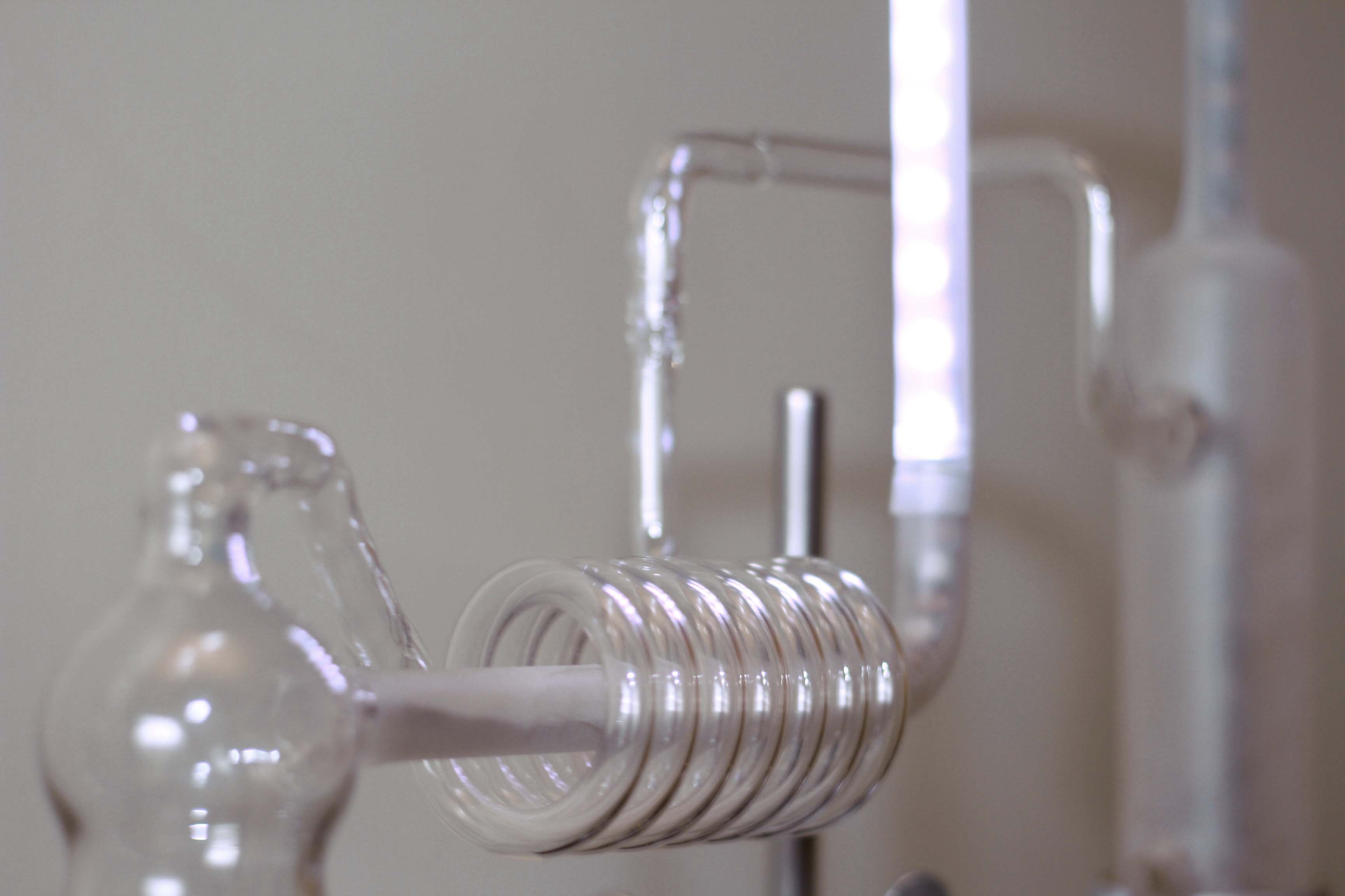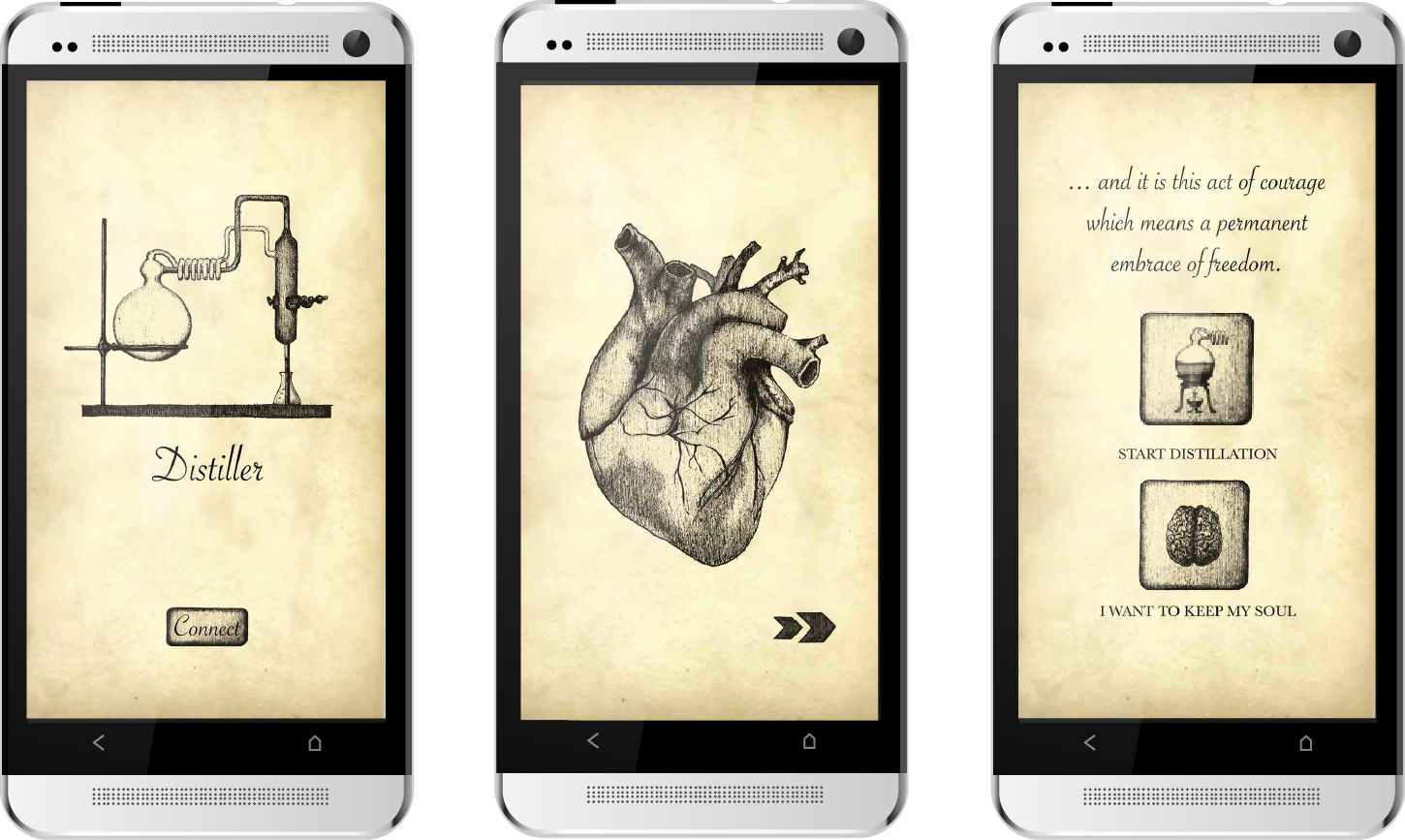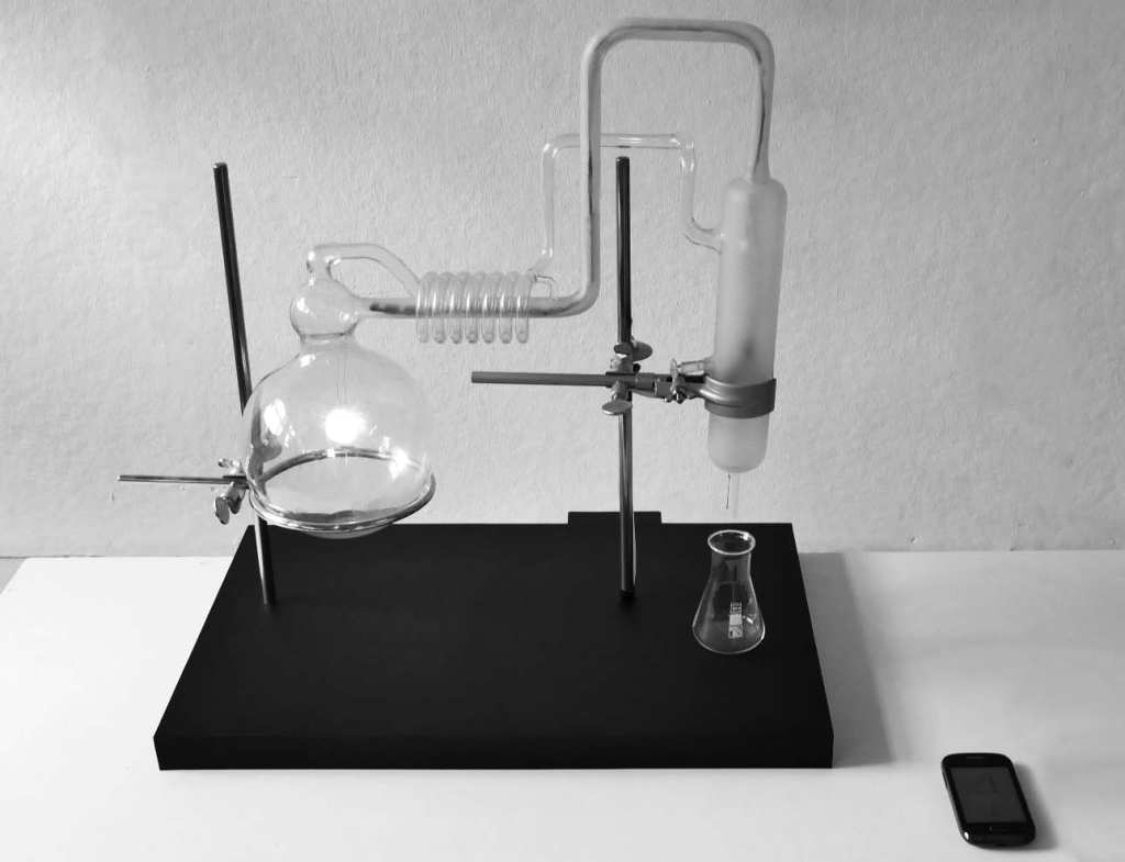 Destilador del “Yo” es una escultura interactiva que crea un dialogo con el participante, desde un punto de vista científico, acerca de su propia percepción del concepto de alma y de conciencia. Usando una aplicación móvil, la obra lee el ritmo cardiaco de la persona y lo representa inicialmente en una animación en la pantalla del celular y posteriormente como una luz palpitante dentro de la escultura de vidrio. El dialogo toma parte a través de la misma aplicación, que dependiendo de las ideas del participante puede destilar la representación de luz y transformarla en una gota de agua que se evapora al caer dentro del Erlenmeyer.